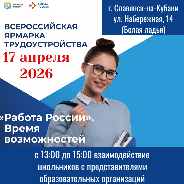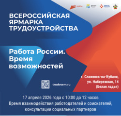 Всероссийская ярмарка трудоустройства «Работа России. Время возможностей» пройдет Славянске-на-Кубани 17 апреля 2026 года. |