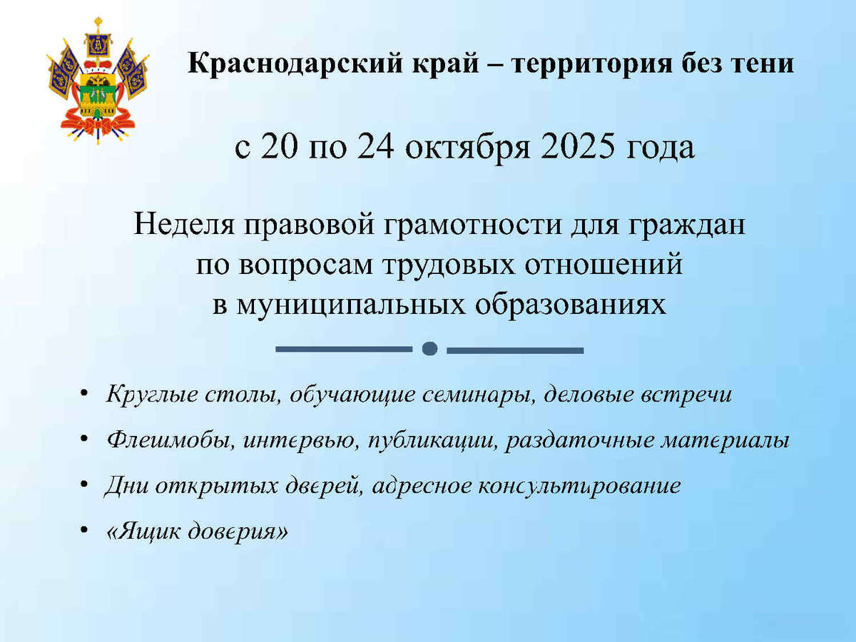 Министерство труда и социального развития Краснодарского края информирует о недели правовой грамотности по вопросам трудовых отношений в 2025 году и проводит мероприятие с 20 по 24 октября 2025 года "Краснодарский край - территория без тени". | |