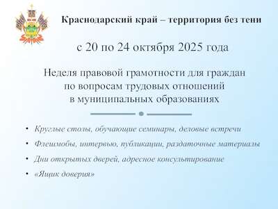 В период с 20 по 24 октября 2025 года на территории муниципального образования Славянский район будет проходить неделя правовой грамотности по вопросам трудовых отношений «Краснодарский край – территория без тени».