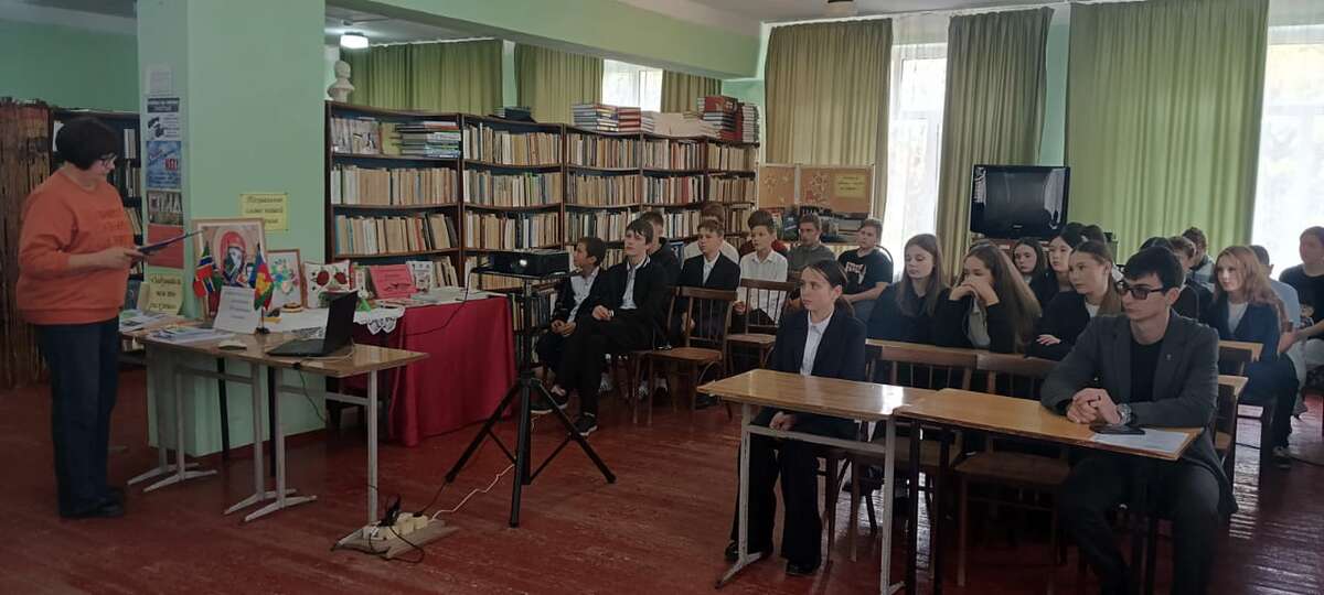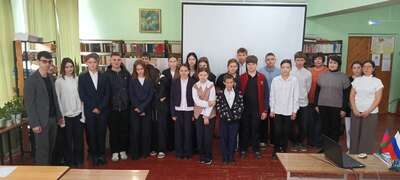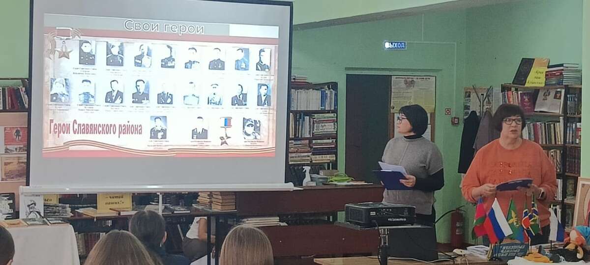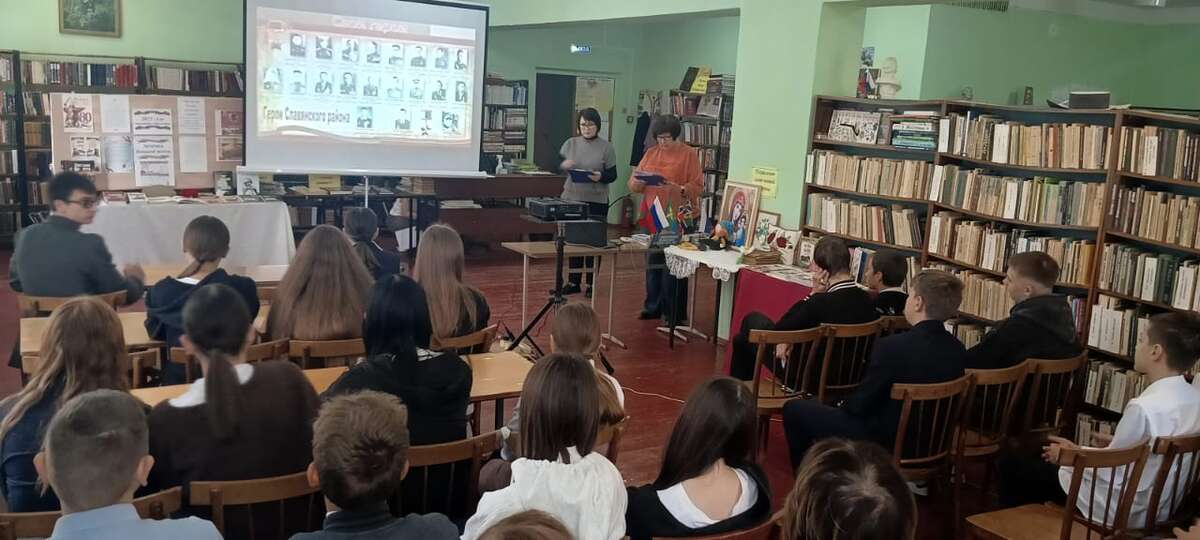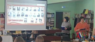 16 октября 2025 года в сельской библиотеке х. Галицын для учащихся восьмых классов работники информационно-библиографического отдела Славянской межпоселенческой центральной библиотеки ми. Н. Я. Данилевского провели патриотический час «Свои герои», состоявшийся в рамках районного библиотечного десанта «ПоZывной – Победа», посвященного Году защитника Отечества. Ребята узнали о двадцати лучших сынах г. Славянска-на-Кубани и Славянского района, удостоенных за мужество, отвагу и героизм высшей награды Родины – звания Герой Советского Союза и Герой Российской Федерации. Все, кто удостоен этой награды – это, безусловно, люди самой высокой пробы. Ими гордятся, на них равняются, их именами называют улицы, площади. В жизни каждого из них был подвиг. Подвиг во имя своего народа, ради свободы и процветания Родины. Ребята могли увидеть лица героев благодаря презентации и прослушать информацию о них: подробный рассказ о жизни и подвиге Героя Советского Союза Евгения Зикрана, погибшего в 1944 году в Прибалтике; о семи Героях Советского Союза - учениках лицея №1, носящего их имя; о Герое Советского Союза Василии Колесникове, руководившем операцией по взятию дворца Амина в Афганской демократической республике в 1979 году; о Герое Российской Федерации Геннадии Таранце - участнике антитеррористической операции в Чеченской республики; о Герое Российской Федерации Михаиле Боярко, получившим это звание на Специальной военной операции. В завершении встречи ребята смогли увидеть видеоролик с песней и фрагментами нового художественного фильма «В списках не значился» по одноименному произведению писателя-фронтовика Бориса Васильева | |