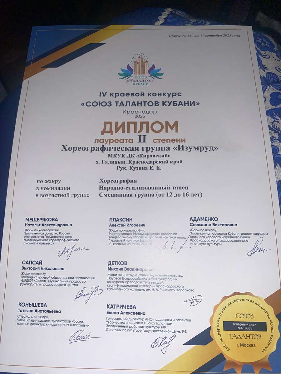 26 октября 2025 года в Краснодаре при поддержке Министерства культуры Краснодарского края и ГАУК КК «Агентство культуры и искусства», а также автономной некоммерческой организации поддержки и развития творческих инициатив «Союз талантов» состоялся IV краевой конкурс «Союз Талантов Кубани», куда были приглашены творческие ребята Славянского района. Свой талант на сцене концертного зала Кубанского казачьего хора смогли показать участники хореографической группы «Изумруд». Достижения ребят в области хореографического искусства оценивало почетное жюри конкурса, в состав которого входили заслуженные артисты России и мастера спорта международного класса. По результатам конкурса наши звездочки привезли диплом лауреата 2 степени! Поздравляем коллектив и их руководителя Кузину Евгению Евгеньевну с заслуженной наградой и желаем дальнейших творческих успехов! | |